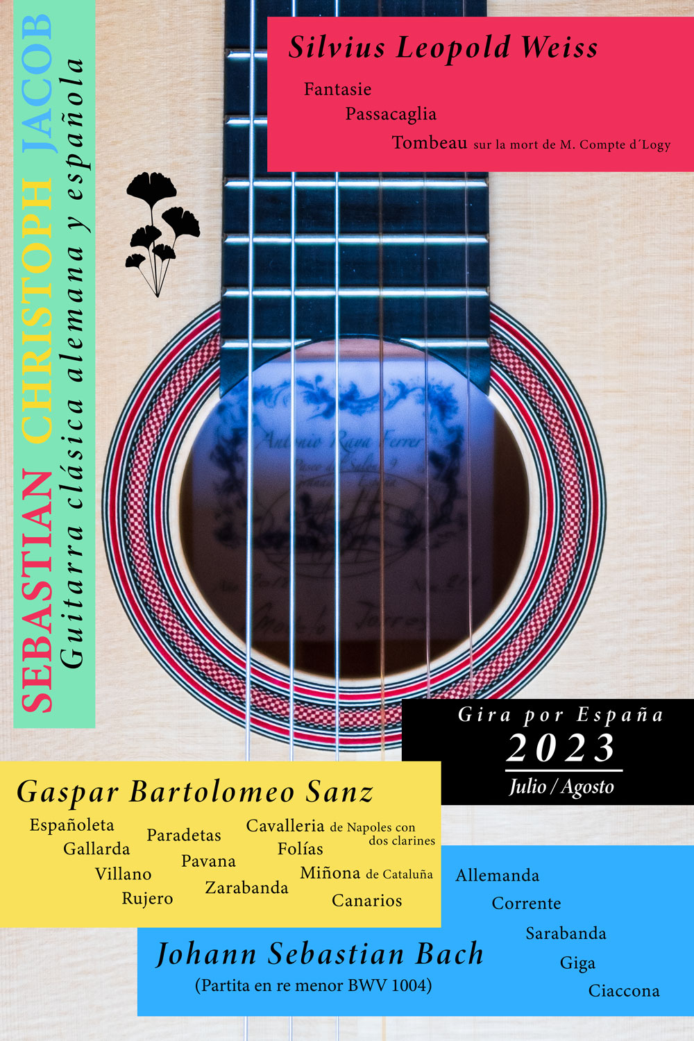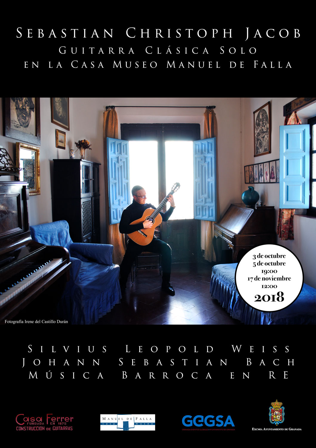 Sebastian Christoph Jacob spielt im Casa Museo de Falla einen Barockzyklus mit Werken in D von Silvius Leopold Weiss (Fantasie, Passacaglia und Tombeau) sowie Johann Sebastian Bach (Partita II BWV 1004) auf der Konzertgitarre (Matinéekonzert).