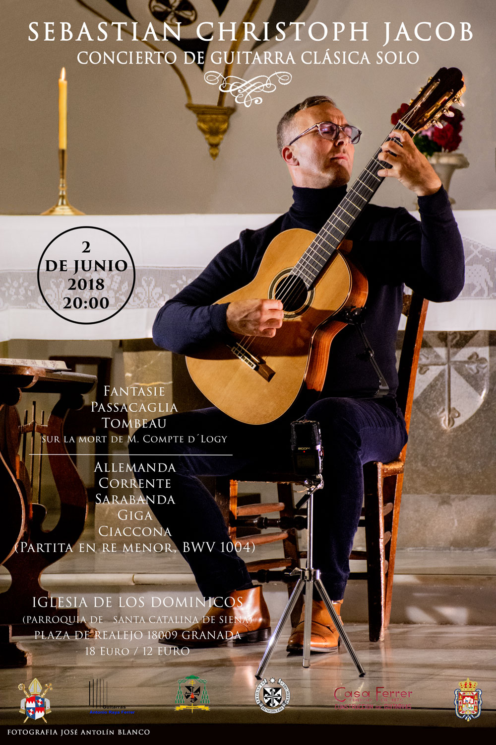 Sebastian Christoph Jacob spielt Werke von Silvius Leopold Weiss (Fantasie, Passacaglia, Tombeau) und Johann Sebastian Bach (Partita II, BWV 1004) in der Iglesia de los Dominicos (Parraoquia de Santa Catalina de Siena) in Granada, Spanien.