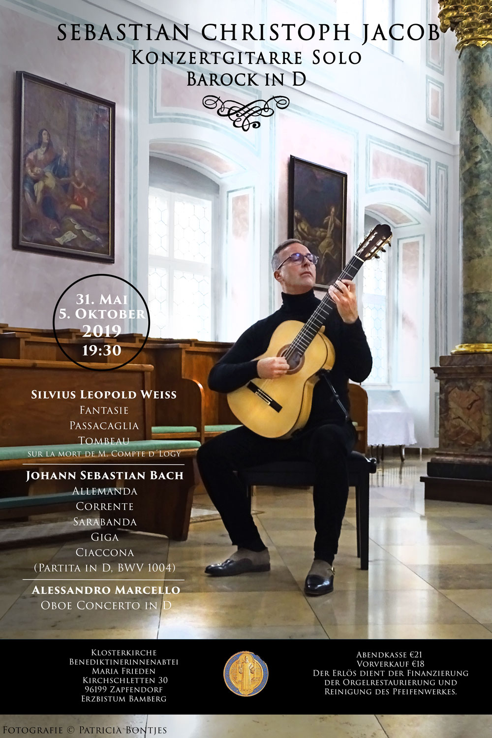 Sebastian Christoph Jacob spielt in der Abteikirche der Benediktinerinnen Maria Frieden Werke von Silvius Leopold Weiss (Fantasie, Passacaglia und Tombeau) und Johann Sebastian Bach (Partita II BWV 1004) auf der Konzertgitarre.