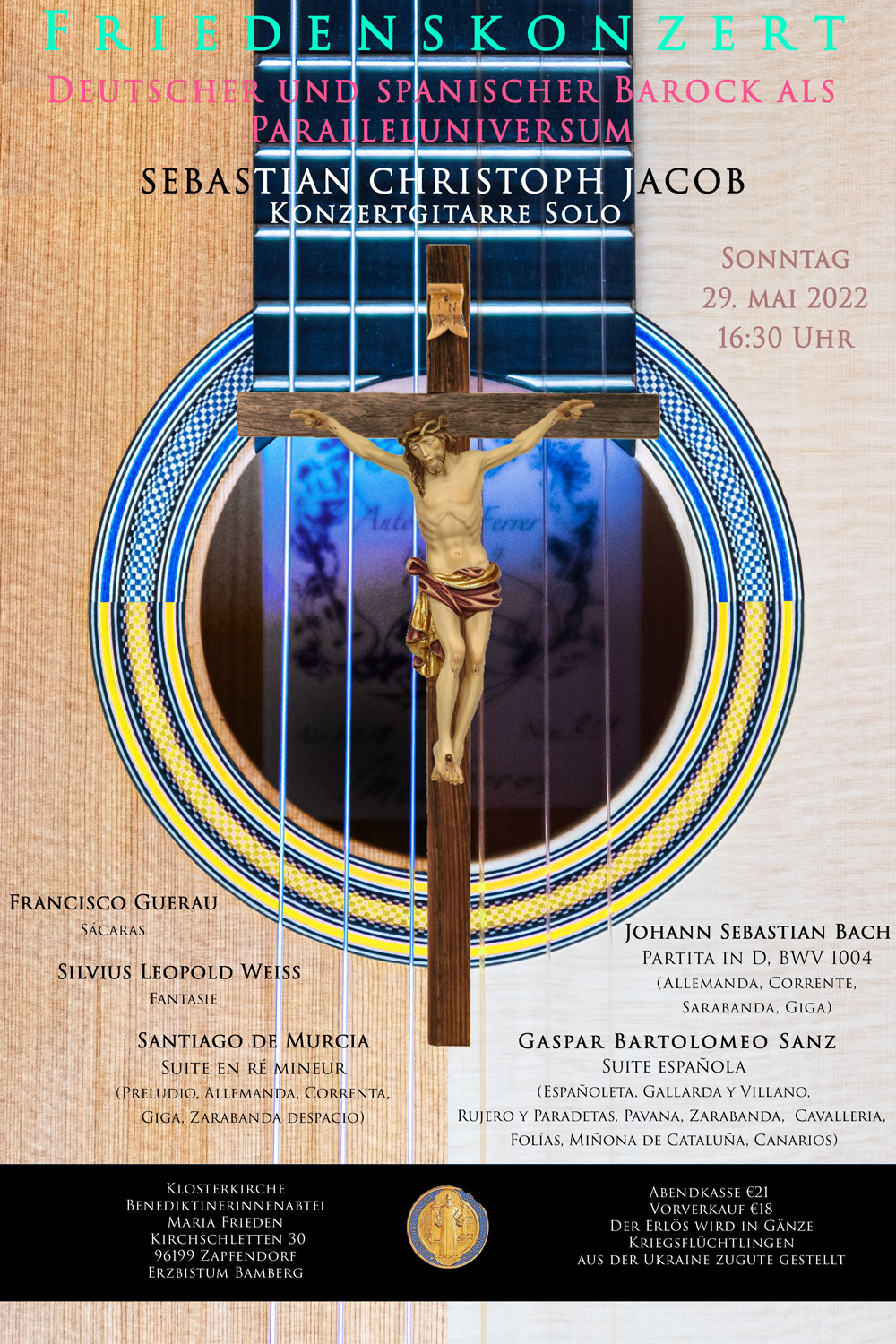 Deutscher und spanischer Barock als Paralleluniversum. Barockwerke aus dem 17. und 18. Jahrhundert. (Francisco Guerau, Santiago de Murcia, Silvius Leopold Weiss, Johann Sebastian Bach, Gaspar Bartolomeo Sanz.) Der Erlös wird in Gänze Kriegsflüchtlingen aus der Ukraine zu Gute gestellt.