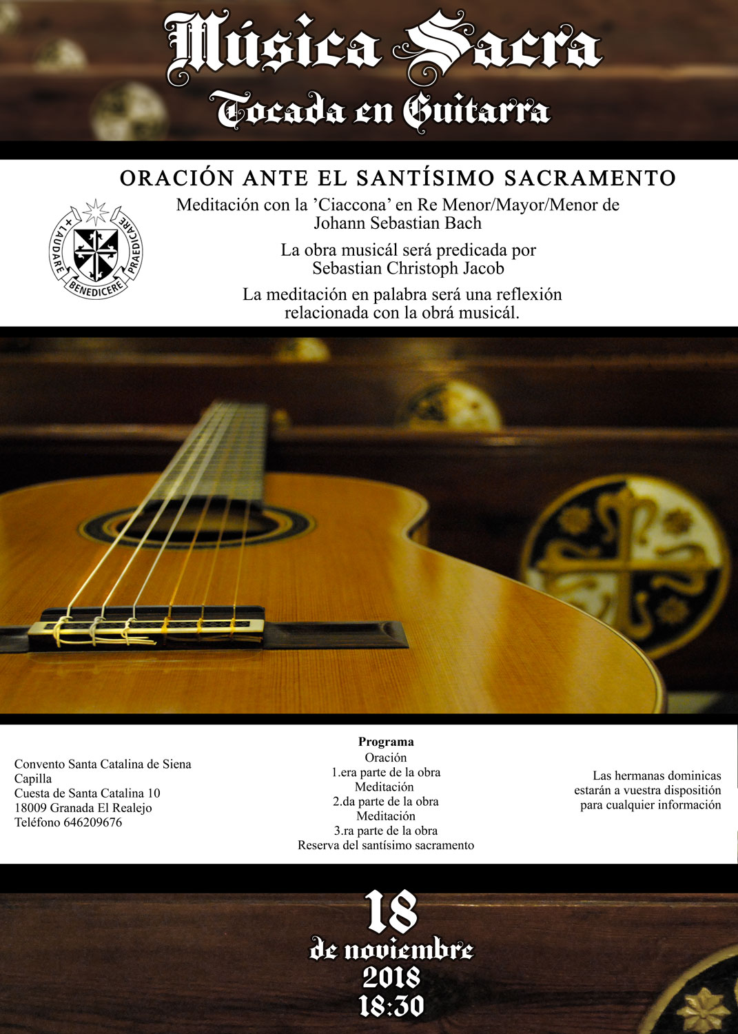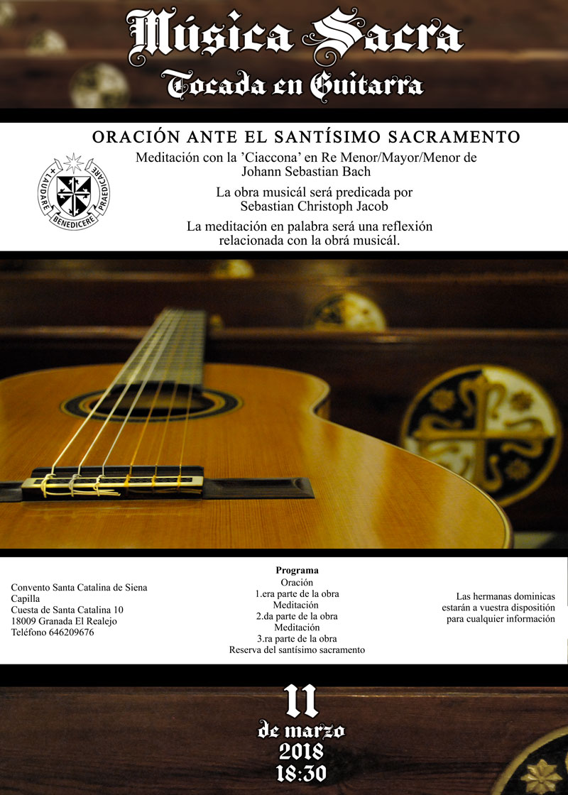 Sebastian Christoph Jacob spielt das Programm "Deutscher Barock in spanischen Gärten/Barocco Alemán en jardines españoles" im Garten des Dominikanerinnen-Klosters Realejo mit einem Zyklus aus Werken des Barock in D von Silvius Leopold Weiss (Fantasie, Passacaglia und Tombeau) sowie Johann Sebastian Bach (Partita II BWV 1004) auf der Konzertgitarre.