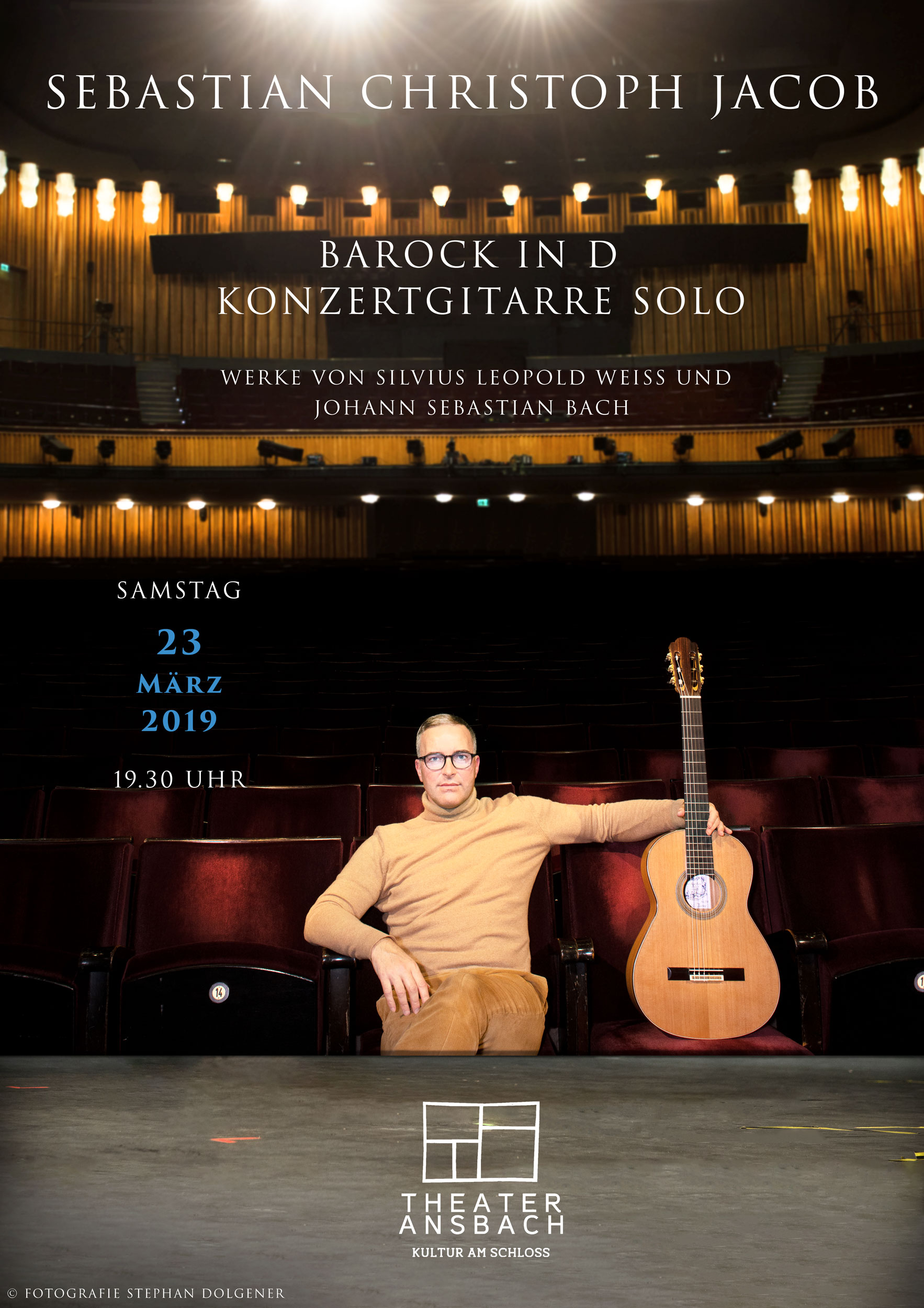 Sebastian Christoph Jacob spielt im Großen Haus des Theater Ansbach einen Barockzyklus in D mit Werken von Silvius Leopold Weiss (Fantasie, Passacaglia und Tombeau) und Johann Sebastian Bach (Partita II BWV 1004) auf der Konzertgitarre.